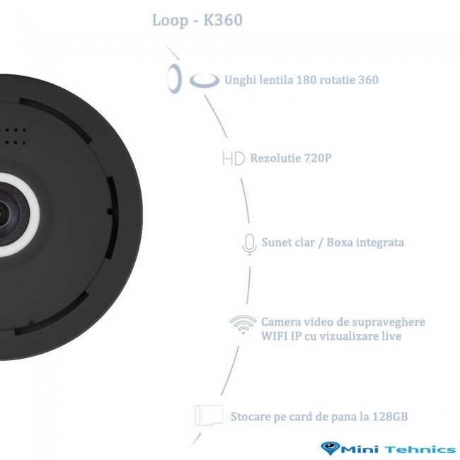 Microcamera video de supraveghere IP WiFi LOOP-K360 cu lentila FishPRO de 360 de grade ofera o vedere panoramica asupra incaperii monitorizate. LOOP-K360 este una din cele mai complexe camere de supraveghere de pe piata avand : sistem de nightvision integrat, rezolutie video HD 720P, slot pentru card micro-SD de pana 128GB, microfon pentru ascultare live, conexiune wifi la internet, senzor de miscare si vedere panoramica la 360 de grade in perspectiva curbliniara.
