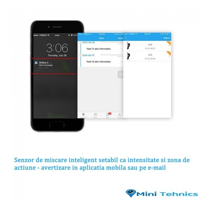 Senzorul de miscare integrat va informeaza in timp real de orice miscare din incapere, camera LOOP-K360 inregistrand miscarea si trimitand automat pe telefon si pe e-mail notificare insotita de o poza. Raza de actiune a detectorului de miscare este de pana la 7 metri, poate fi setata ca intesitate si poate fi focalizata doar pe unele zone.