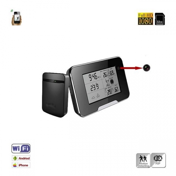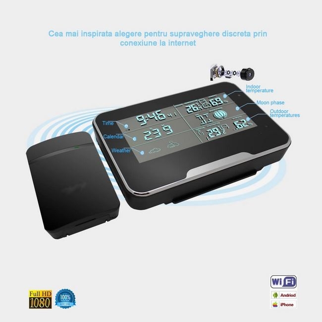 Rezoluția video este FULL HD de 1920 x1080, de o calitate superioară, in culori vii, iar memoria internă suportată de mini camera spion încorporată în stația meteo este un card micro-SD de maxim 32GB .