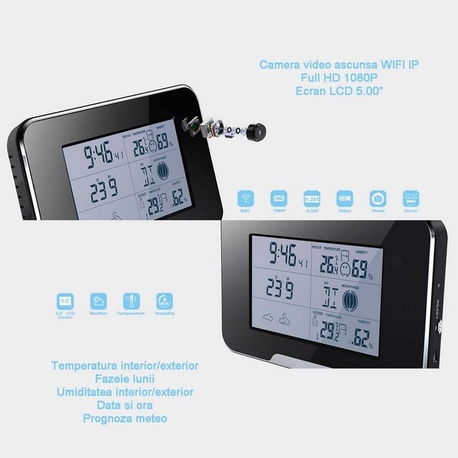 Pe lângă funcția de supraveghere discretă, stația meteo vă va furniza și principalele informații pentru care a fost concepută. Va afișa ora, data(ziua/săptămâna), temperatura externă, umiditatea, fazele lunii, tendința vremii, diverse prognoze meteo. Aceste funcții sunt dependente de unitatea mobilă a stației meteo, care va fi plasată outdoor (comunicare wireless).