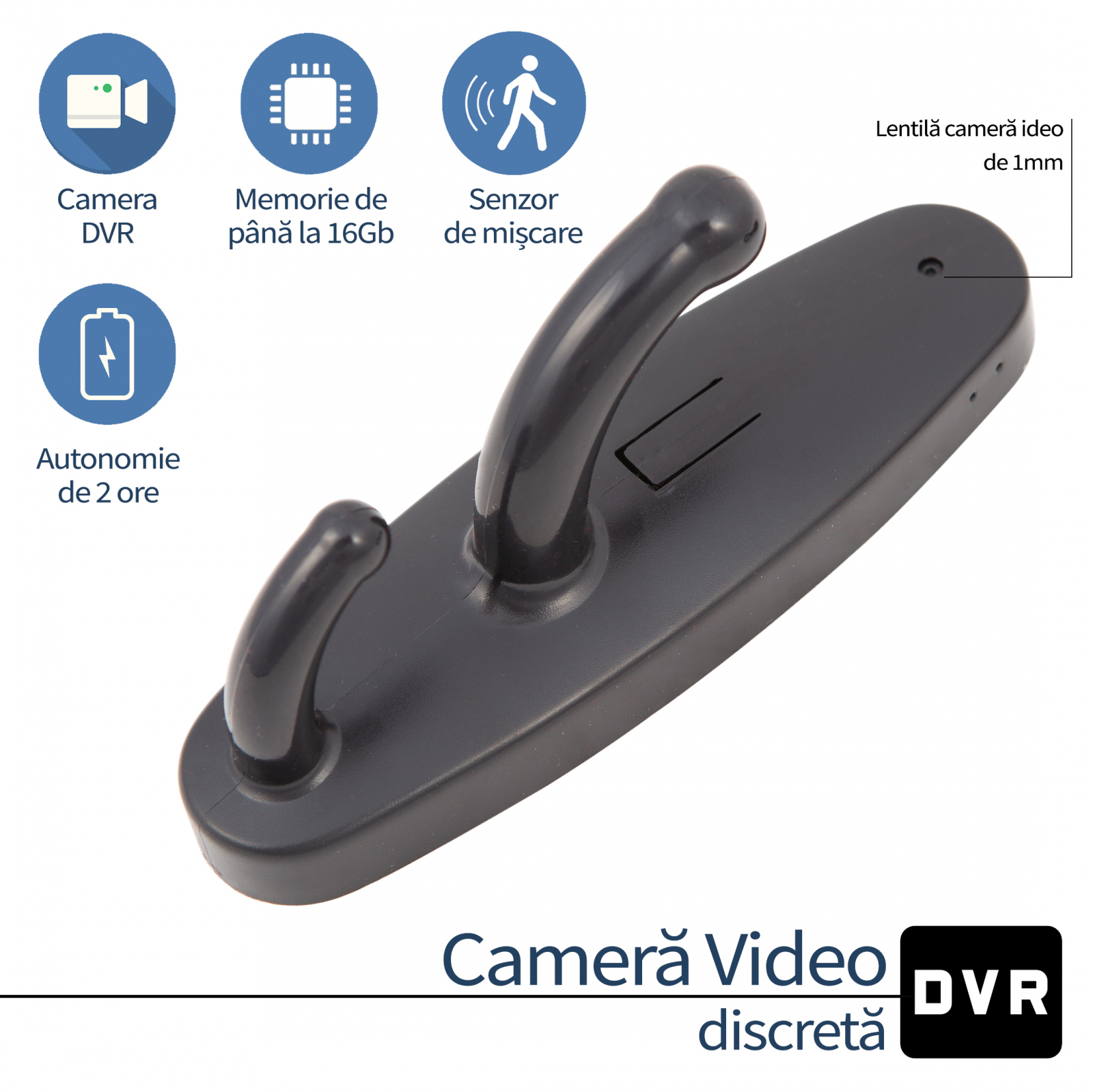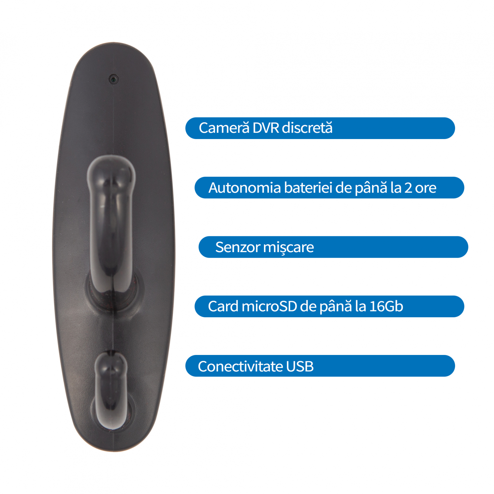 Carlig de cuier cu camera video ascunsa si senzor de miscare. Camera are o rezolutie de 1,3 Mega Pixeli si este extrem de bine camuflata. Inregistrari audio si video de inalta calitate.