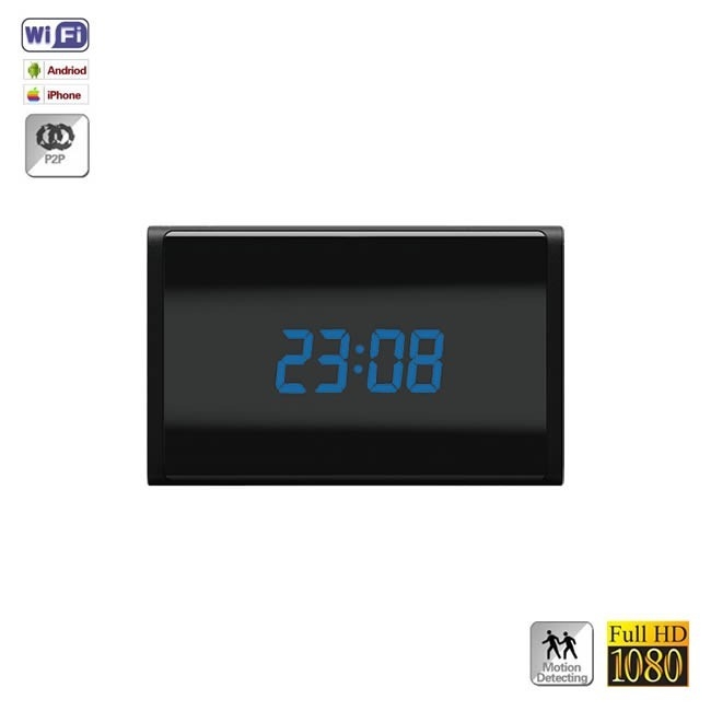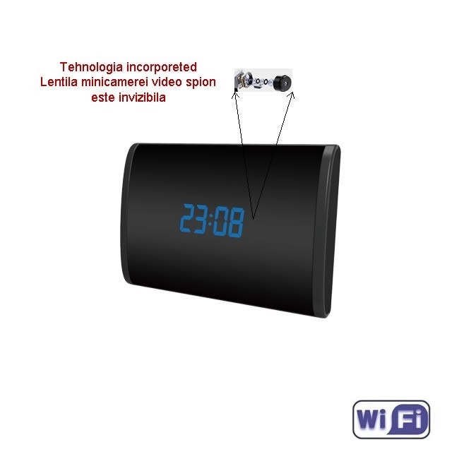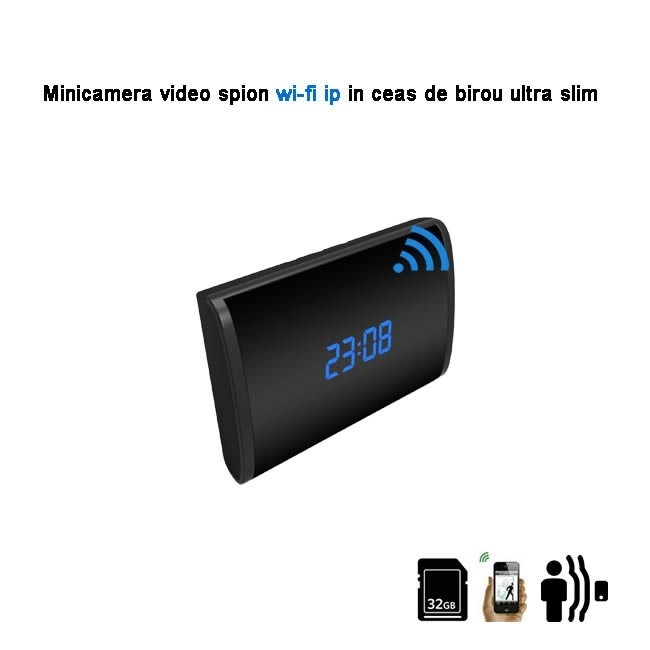 Ceas de birou CSIP2888 dreptunghiular, slim, cu camera video spy Wi-Fi IP 1080P incorporata, cu un design inovativ si elegant, de culoare neagra, ce asigura un plus de discretie. Functiile clasice ale unui ceas digital (afisare ceas, alarma, data) sunt functionale si active, iar lentila este perfect mascata si integrata in designul ceasului.