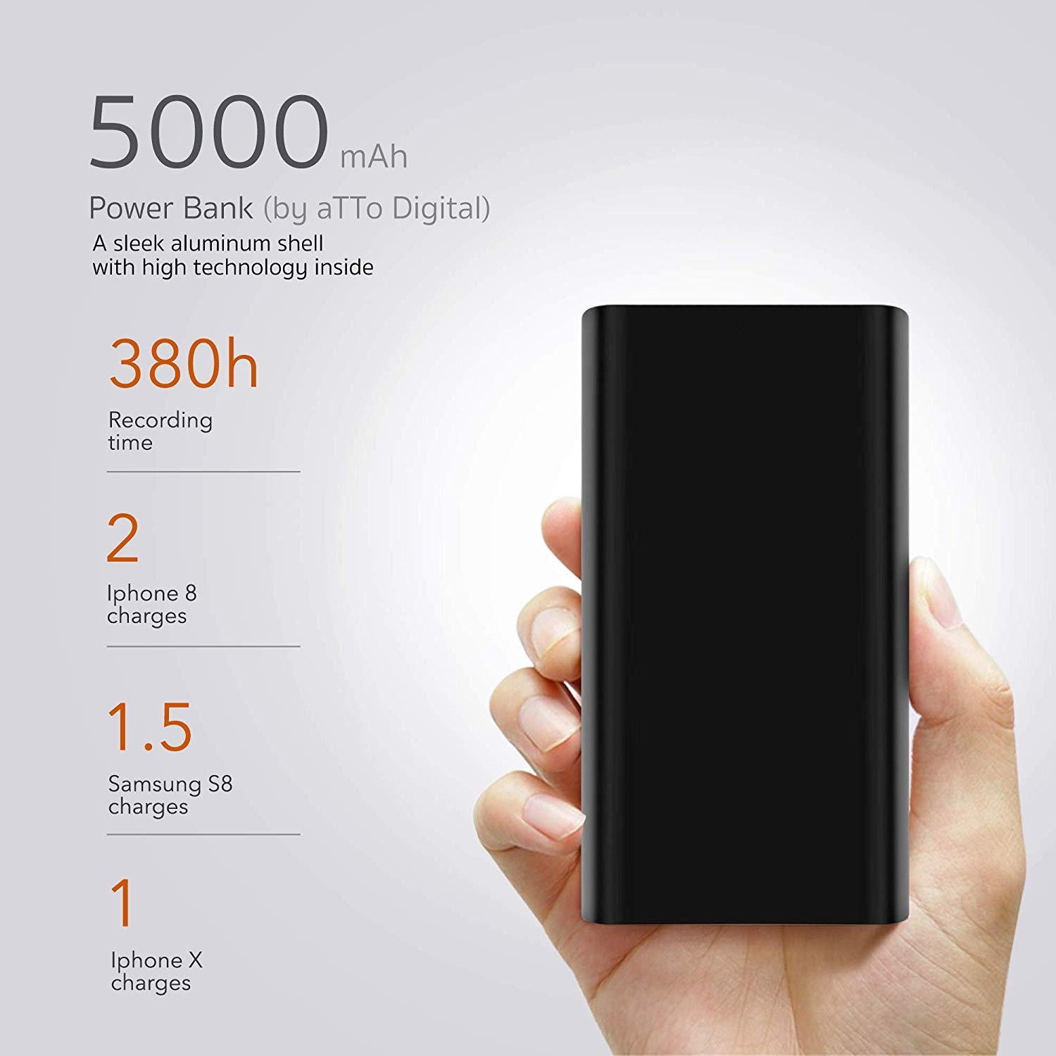 Reportofon profesional mascat în Power Bank cu design compact ce include 2 funcții: reportofon cu autonomie 380 de ore și funcție de încărcare a telefonului.