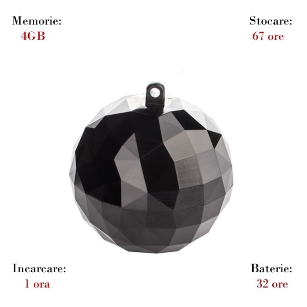 Butonul pentru actionarea functiei de inregistrare se acceseaza prin desurubarea sferei, astfel incat nimeni nu ar putea banui ca este vorba de mai mult decat un simplu breloc pentru chei.